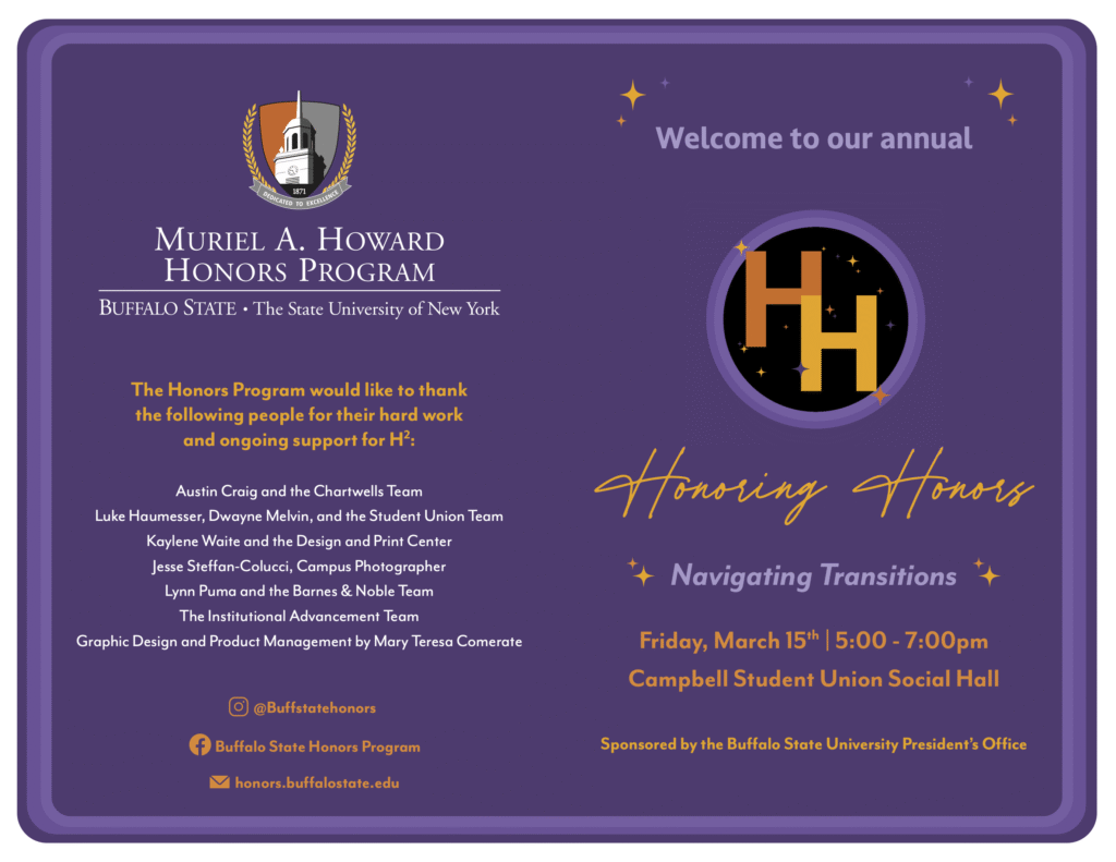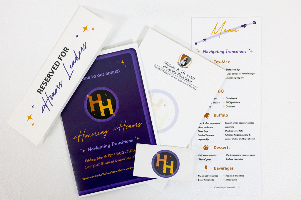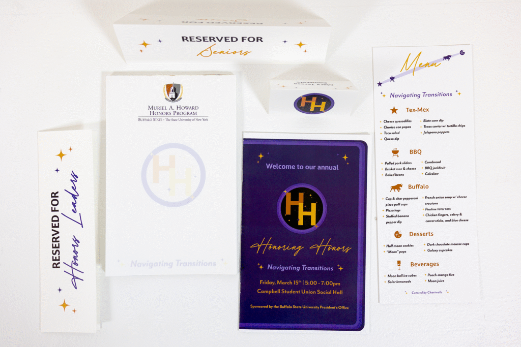 Graphic Design and Product Management for Honors Annual Honoring Honors Event celebrating honors students, particularly the graduating seniors. Items designed include a logo, menu, menu signage for each food table, program, general signage, table cards and notepad.